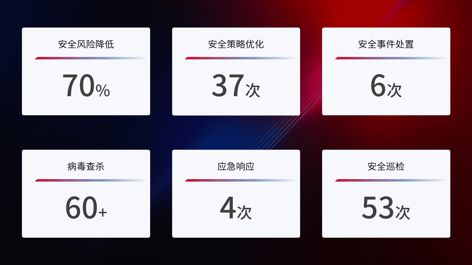 提供全面的安全事件报告体系,,,包括处置报告、、周报、、季度和年度总结,,,,结合持续监控,,,帮助客户深入了解网络安全状况。。。。